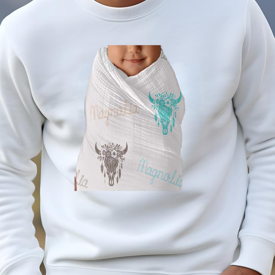 Western Floral Cow Skull Custom Name Baby Swaddle Blanket Sweatshirt