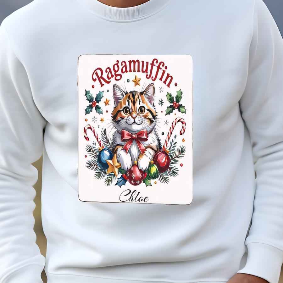 Custom Ragamuffin Cat Sled Ornament: Personalized Name, Christmas Decoration, Unique Pet Gift Sweatshirt