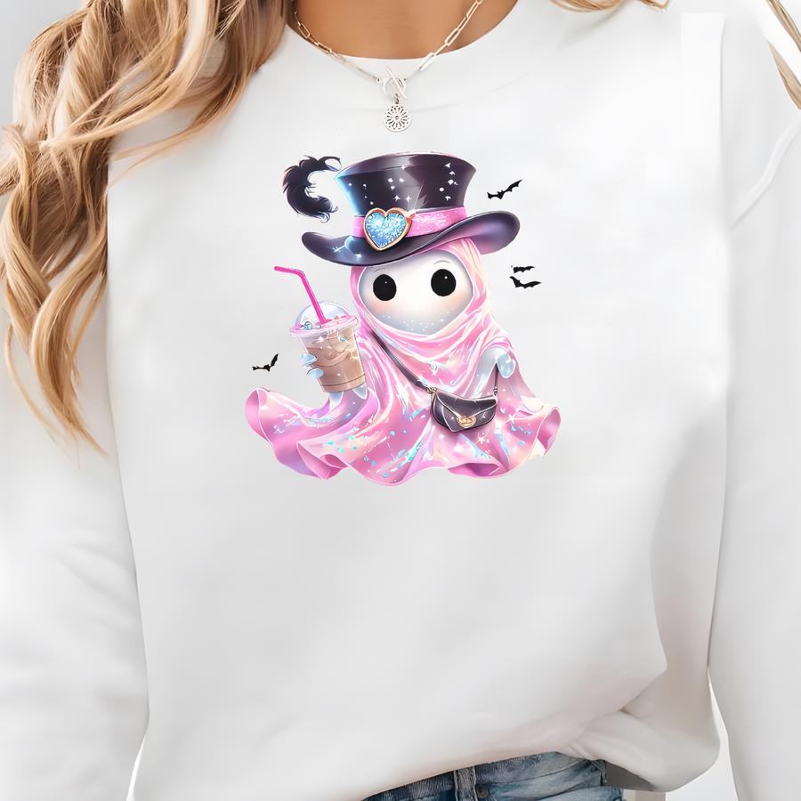 Top Hat Ghost Halloween Shirt, Pumpkin Coffee Halloween Shirt, Cute Girly Ghost Shirt, Halloween Gift For Her, Retro Coquette Ghost Tee Sweatshirt