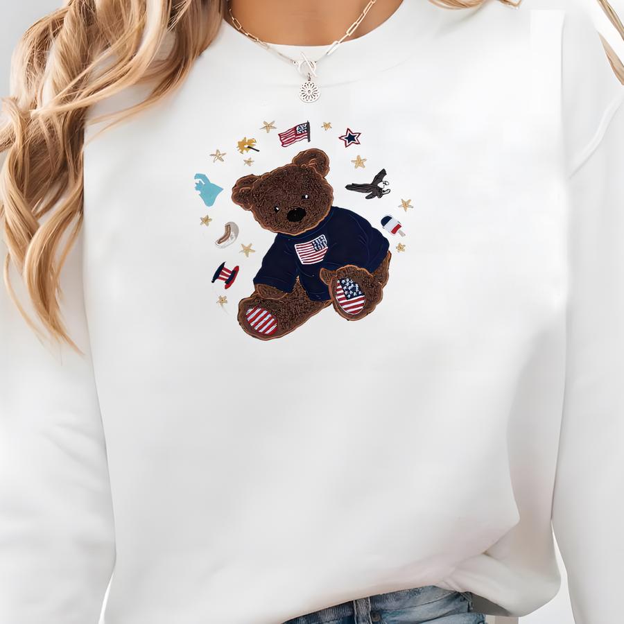 America Teddy Applique Crewneck Sweatshirt, Patriotic Bear Tshirt Sweatshirt