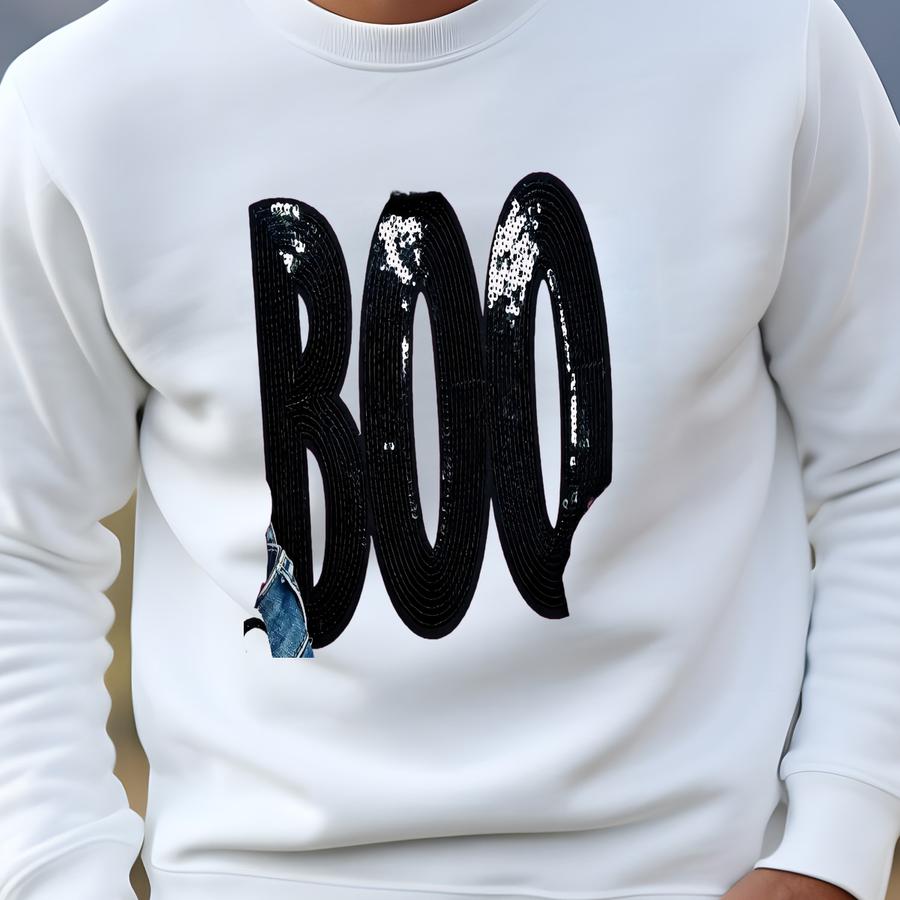 Sequin Black Boo Chenille Patch Crewneck Sweatshirt - Chenille Patch Sweatshirt - Halloween Sweatshirt - Black Boo Sequins - Black Sequins Sweatshirt