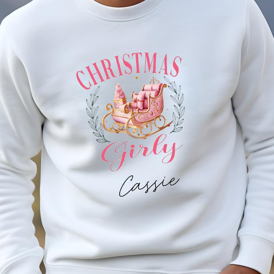 Christmas Girly Tumbler, Personalized Christmas Cup, Holiday Gift For Her, Winter Sleigh Tumbler, Custom Name Cup, Festive Drinkware Sweatshirt