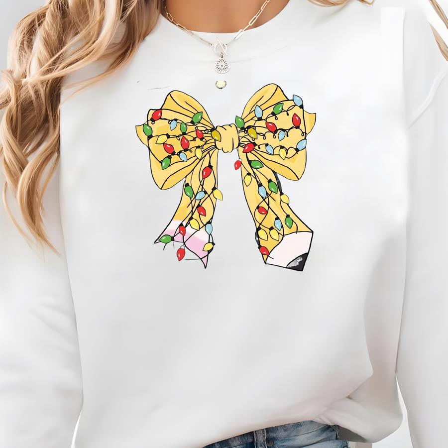 Christmas Coquette Bow Teacher Sweatshirt, Christmas Teacher Gift, Christmas Pencil Bow Teacher Gift Sweatshirt, Christmas Teachers Outfit Sweatshirt