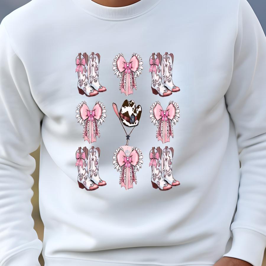 Pink Bow Cowgirl Boots Shirt Country Concert Tee, Coquette Cowgirl Tshirt, Western Cowgirl Boots Shirt, Western Girls Aesthetic Gift Outfit Sweatshirt