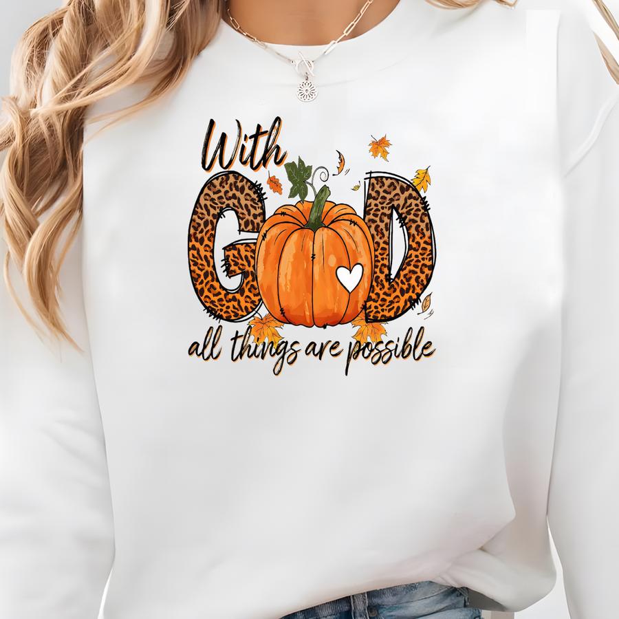 With God All Things Are Possible Sweatshirt, Leopard Pumpkin Shirt, Fall Crewneck, Thanksgiving Sweater, Religious Shirt, Fall Bible Shirts Sweatshirt