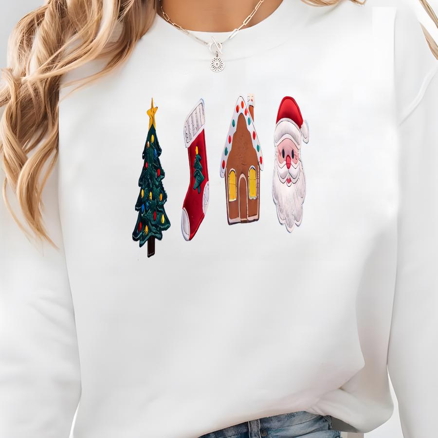 Christmas Sweatshirt, Santa Tree Stocking Gingerbread House Shirt, Cute Holiday Crewneck, Cozy Xmas Gift For Her Sweatshirt