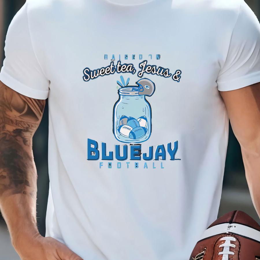 Raised On Sweet Tea, Jesus And Bluejay Football T-shirt