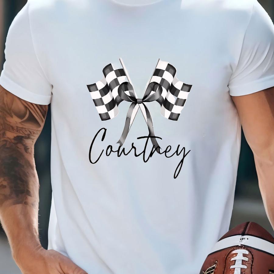 Custom Race Day Shirt For Women, Personalized Racing Shirt, Checkered Bow Coquette Tee, Cute Race Mom Shirt, Bow And Flag Design, Race Wife T-shirt