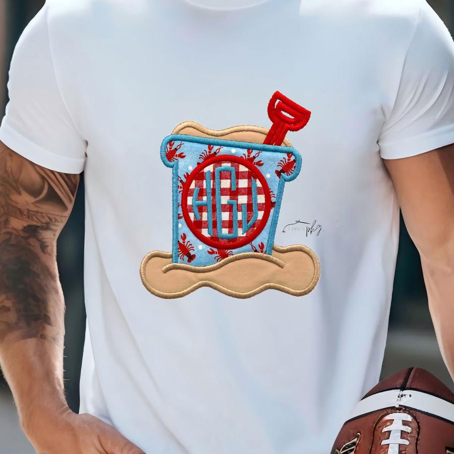 Sand Bucket Boy's Monogrammed Applique Shirt - Summer Beach Wear - Red Blue White - Lobster Beach - Personalized Initials Top - Toddler T-shirt