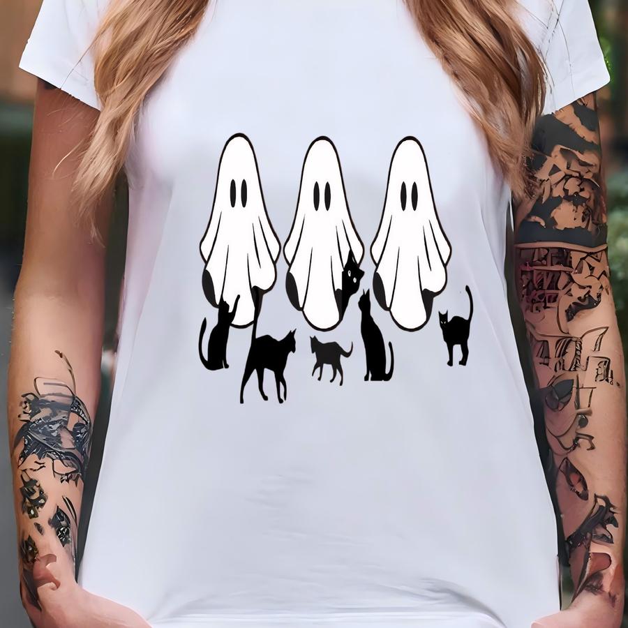 Spooky Cat And Ghost Shirt, Cute Halloweentee For Women,fall Ghost Cat Shirt,cozy Autumn Outfit,halloween Gift,spooky Season T-shirt