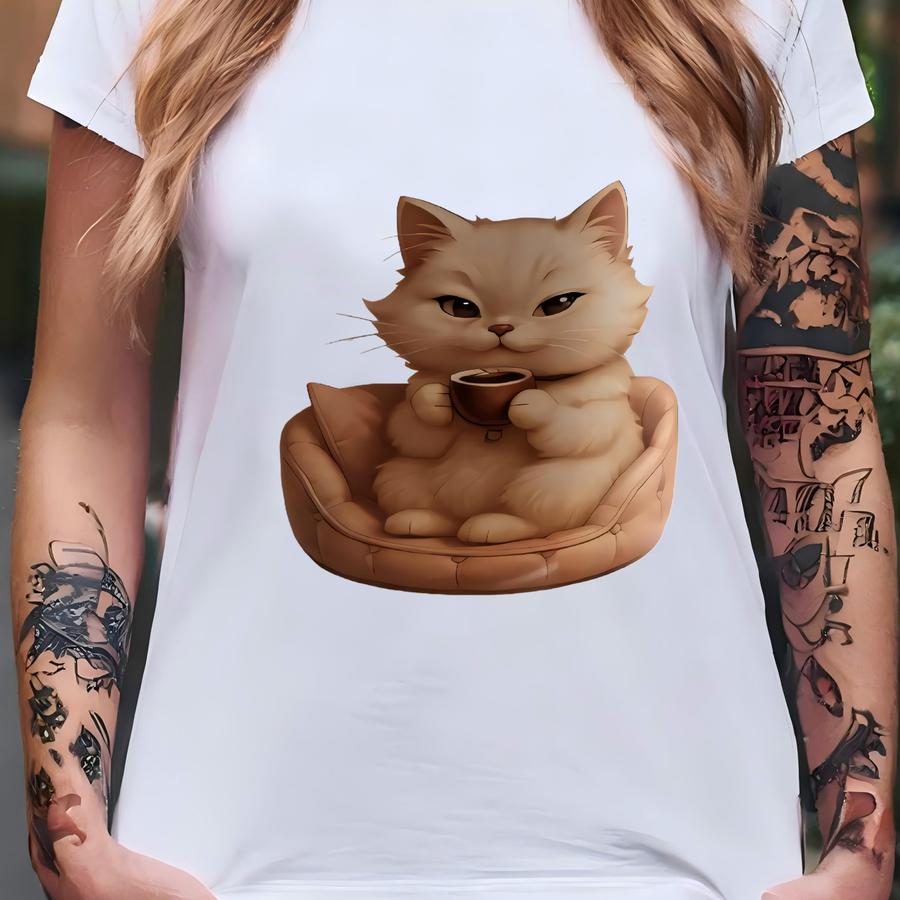 Custom Kitty Drinking Coffee In Her Bed, Personalized Gift For Cat Lover, Ceramic Tea Cup, Cat Mom Present, Cat Lady Mug, Xmas Gift, Cat Dad T-shirt