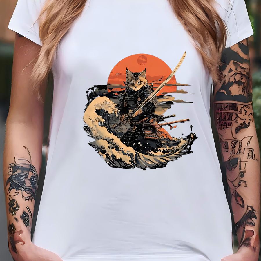Samurai Cat Hoodie, Warrior Cat Sweatshirt, Rising Sun Style Tee, Unique Japanese-inspired Hoodies, Retro Cat Shirt T-shirt