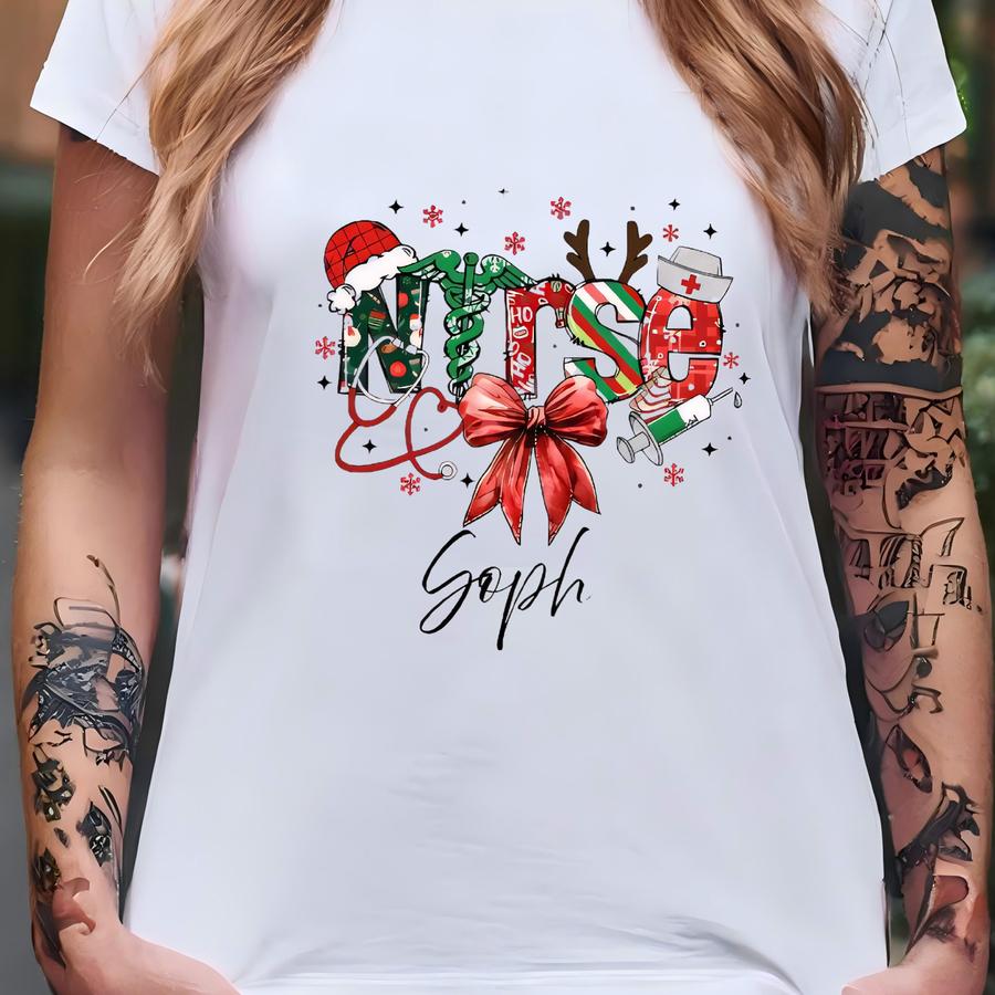 Customized Coquette Christmas Nurse Tshirt, Custom Name Nurse Sweatshirt, Personalized Christmas Nurse Tee, Gift For Nurses, Nursing Apparel T-shirt