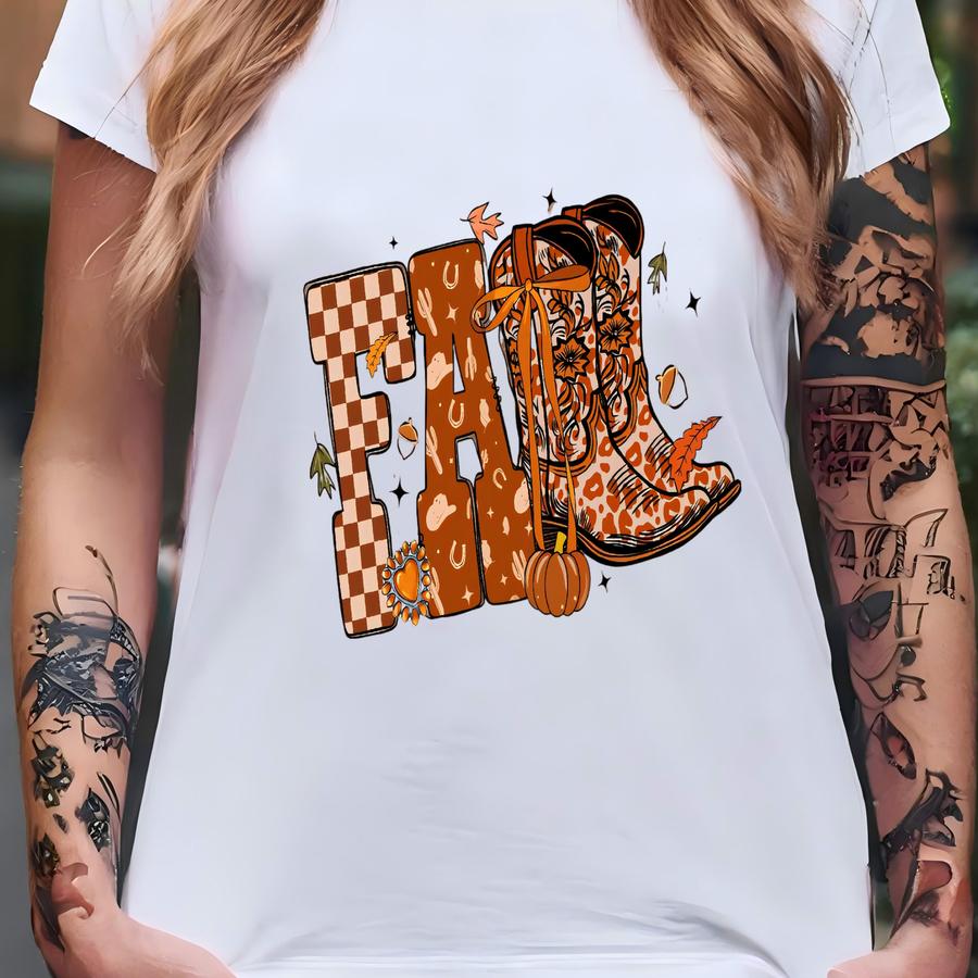 Preppy Fall Boots Western Shirt, Checkered Pumpkin Howdy Tshirt, Retro Cowgirl Autumn Graphic, Cozy Country Rodeo Fall Shirt. T-shirt