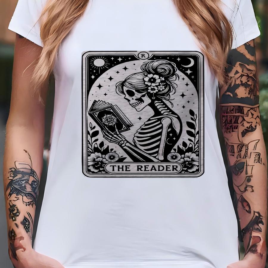 The Reader Tarot Card Shirt, Skeleton Reading Sweatshirt, Book Lover Hoodie, Tarot Lover Gift, Halloween Skeleton Tee, Bookish Gift Hoodie T-shirt