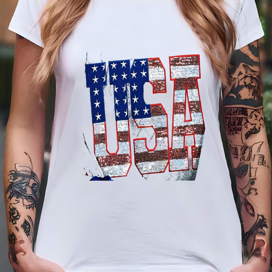 Usa Sequins Chenille Patch Shirt - 4th Of July - Independence Day - Sequins Patch - Patriotic Shirt - Memorial Day Shirt - Women's Hoodie T-shirt