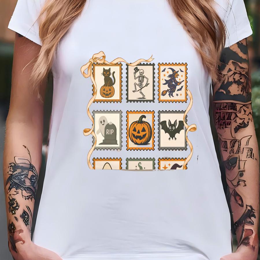 Retro Halloween Sweatshirt, Vintage Stamp Halloween Sweater, Halloween Witch Pumpkin Cat Ghost Shirt, Cute Spooky Fall Sweatshirt, Retro Tee T-shirt