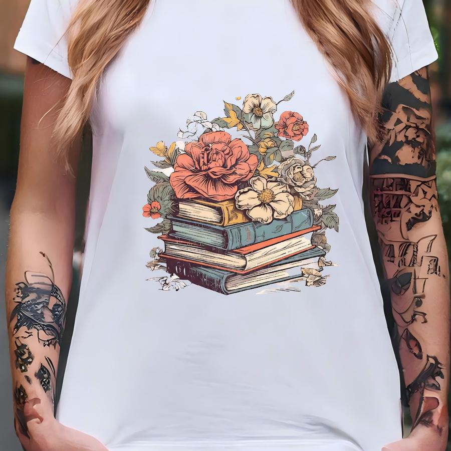 Books And Flowers Tee, Book Lover Tote, Bookish Tee, Book Lover Gift, Canvas Tee, Library, Bookworm Gift, Reusable T-shirt