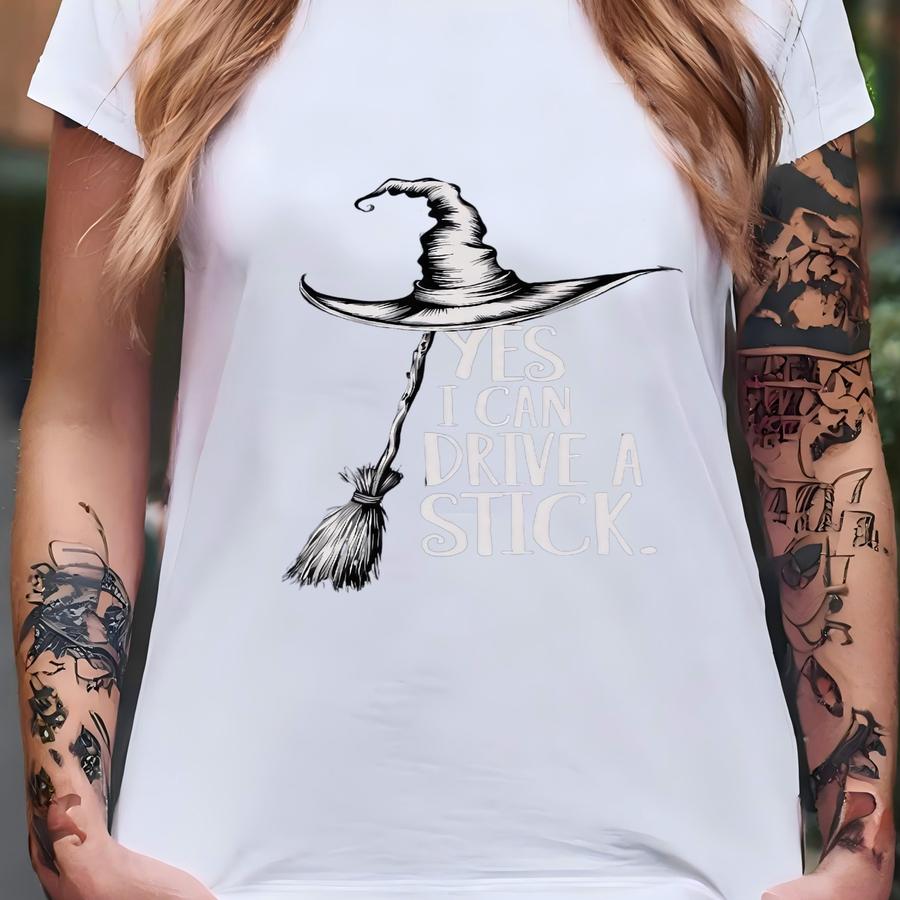 Yes I Can Drive A Stick Shirt, ® Funny Halloween Witch Tee For Women Spooky Party Shirt Cute Halloween Gift Top Witchy Costume T-shirt
