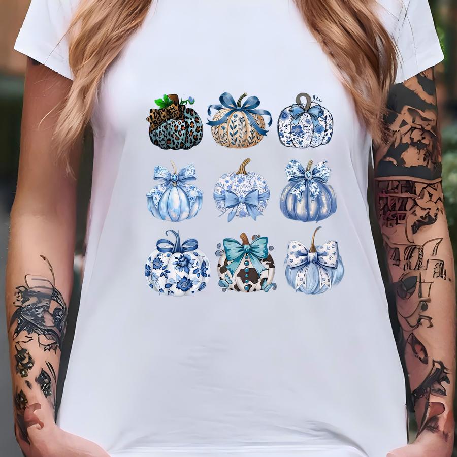 Authentic Blue Bow Pumpkin Shirt Preppy Fall Shirt For Women Girls Cute Autumn Tee Pumpkin Patch Outfit Thanksgiving Shirt T-shirt