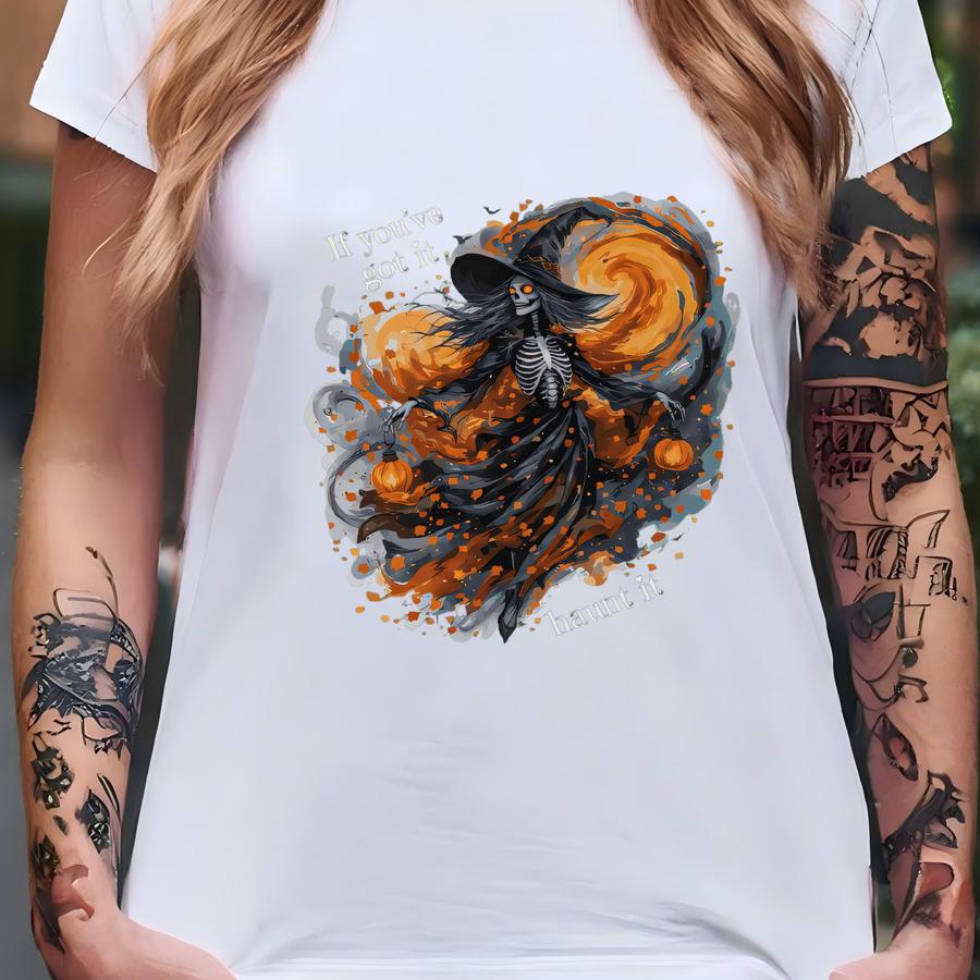 Watercolor Skeleton Sweatshirt For Women, Chic Witch Shirt For Women, Colorful Women Halloween Sweatshirt, Cute Halloween Party Tshirt T-shirt