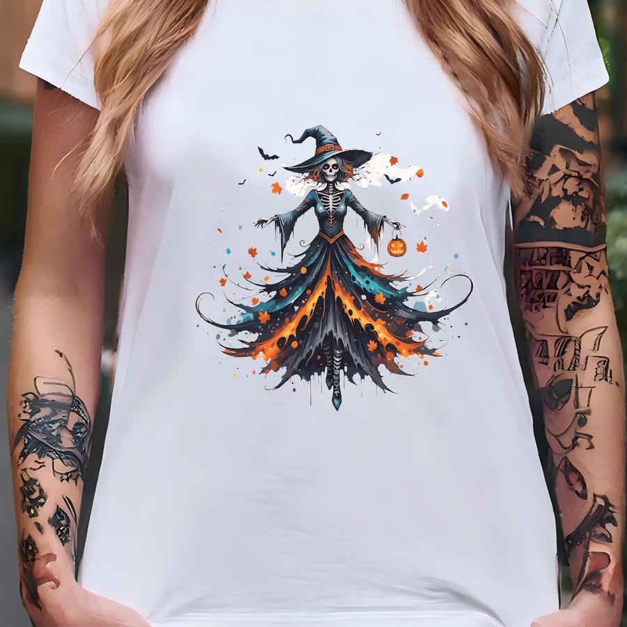 ® Watercolor Skeleton Shirt For Women, Chic Witch Shirt For Women, Colorful Women Halloween Shirt, Cute Halloween Party Tshirt T-shirt