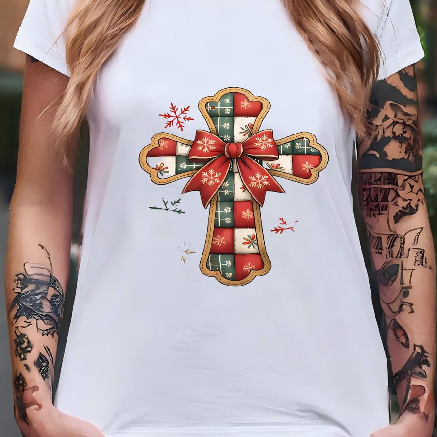 Christian Christmas Sweatshirt Faux Patchwork Cross Crewneck Faith Holiday Sweatshirt Jesus Christmas Shirt Religious Gift For Her Festive T-shirt