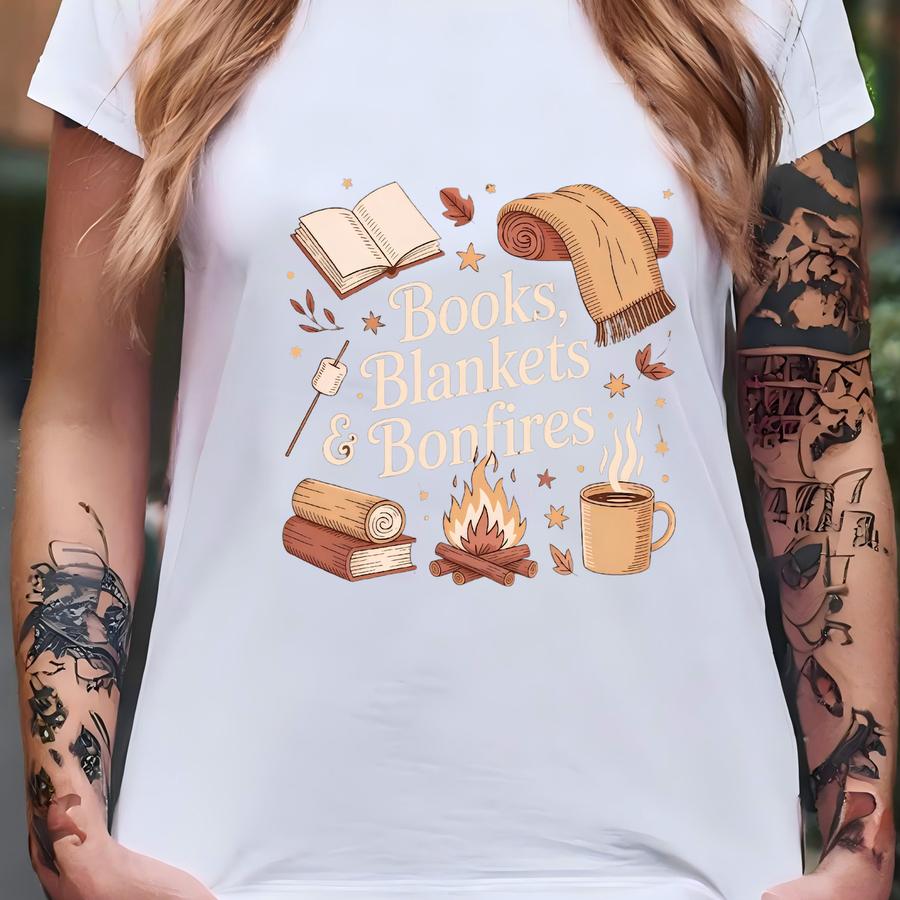 Books Blankets Bonfires Shirt, Cozy Fall Reading Shirt, Autumn Camping Shirt, Cute Boho Book Lover Shirt, Funny Bookish Shirt T-shirt