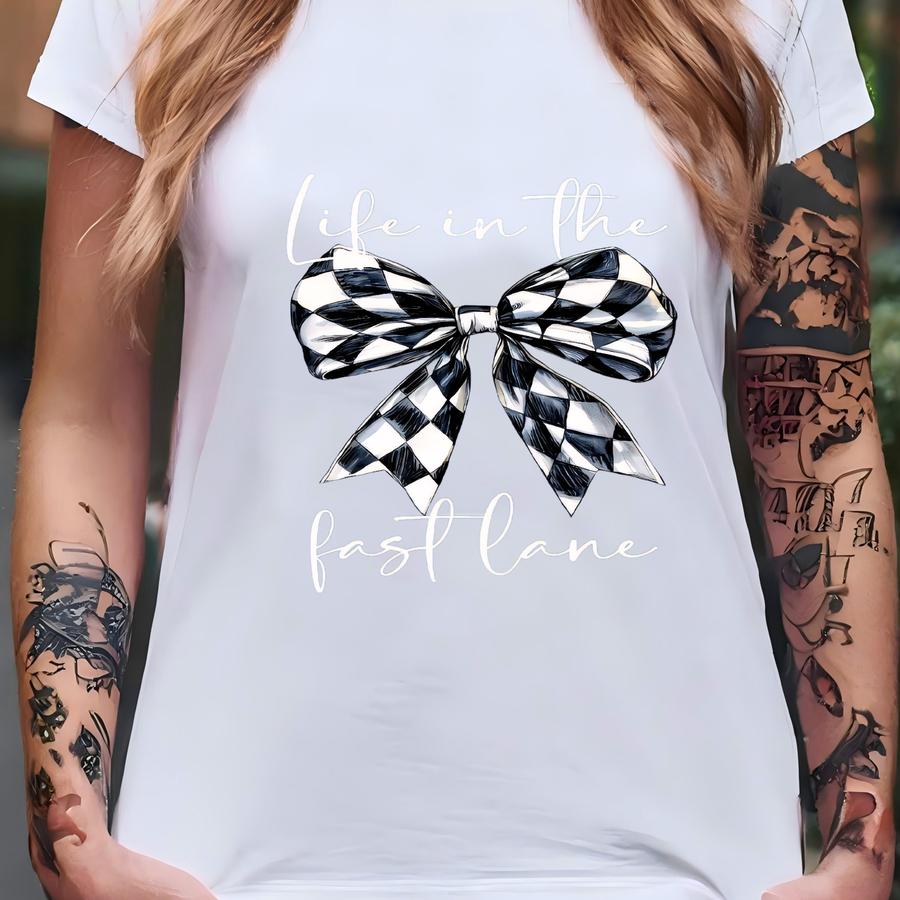 Race Day Shirt, Life In The Fast Lane Tee, Checkered Bow Graphic Tee, Car Girl Gift, Racing Tshirt For Her, Racer Life T-shirt