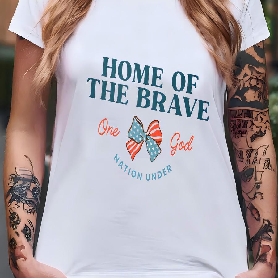 ® Home Of The Brave Patriotic Shirt, American Flag Bow Shirt, Cute 4th Of July Usa Graphic Tee, Unisex Summer Apparel T-shirt