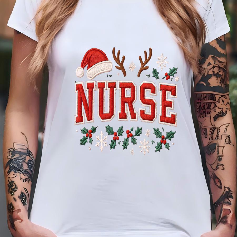 Christmas Nurse Sweatshirt, Reindeer Antler Santa Hat Rn Shirt, Holiday Nurse Gift, Festive Nursing Apparel T-shirt