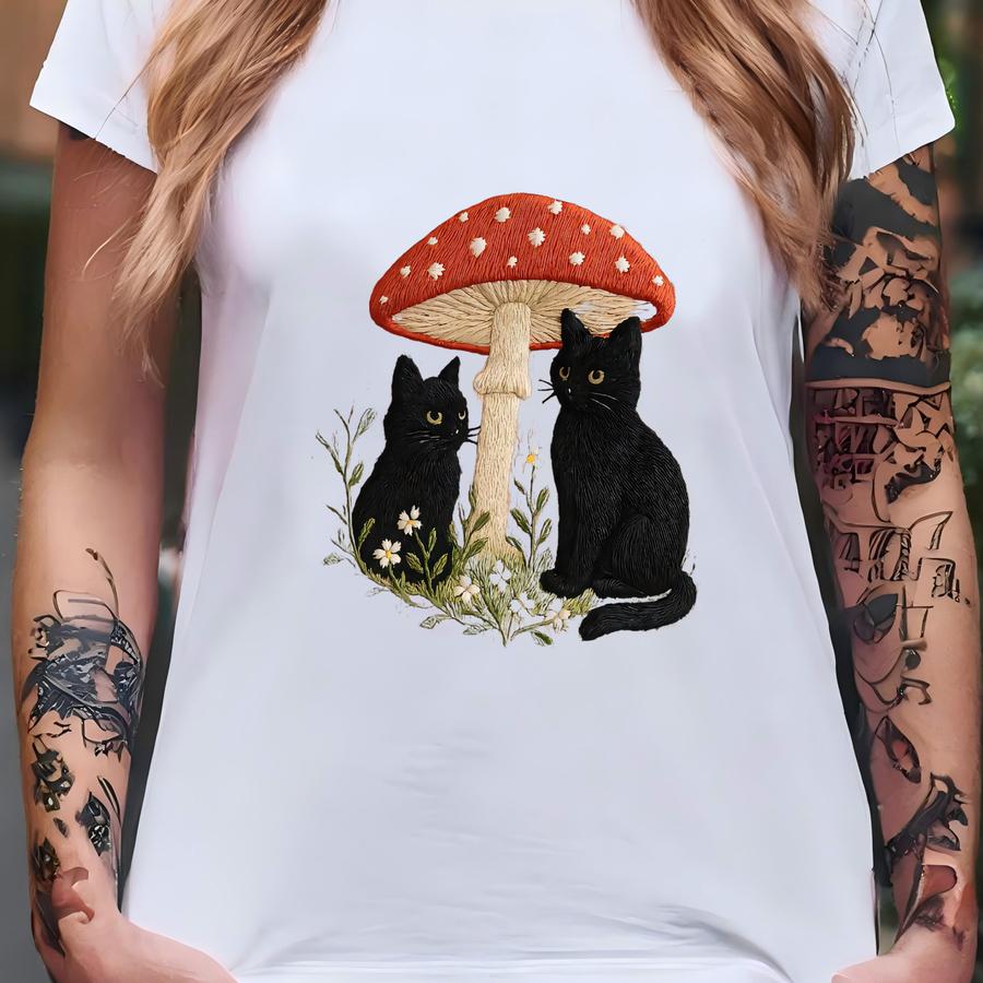 Two Black Cats Under Giant Mushroom Sweatshirt, Floral Wreath Cottagecore Gift, Witchy Feline Lover Pullover, Aesthetic Apparel T-shirt