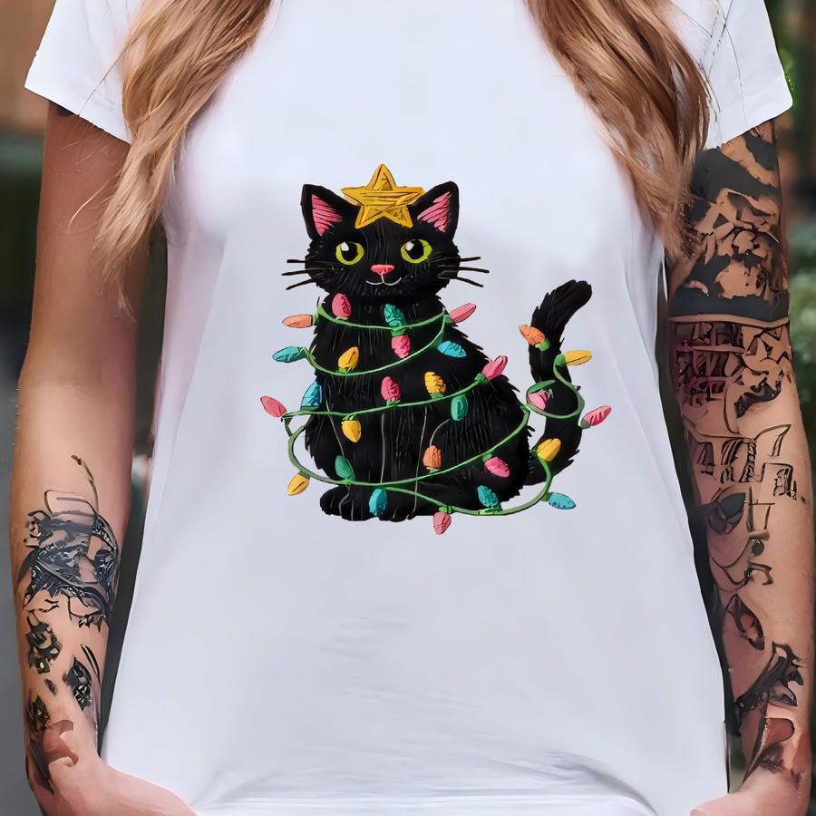 Black Cat Christmas Lights Sweatshirt, Festive Feline Sweater, Cute Kitty Crewneck, Holiday Tree Cat, Cat Lover Gift T-shirt