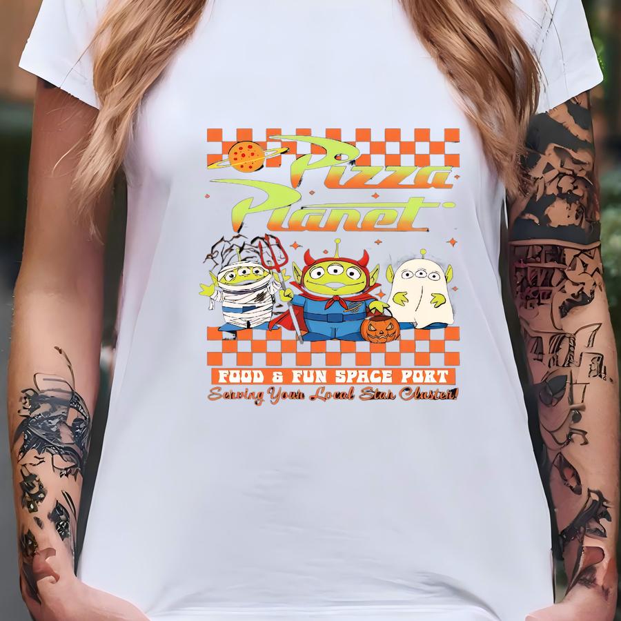 Aliens Pizza Planet Halloween Shirt, Planet Halloween Gift, Spooky Season Tee, Land Halloween Vacation Kids Women T-shirt