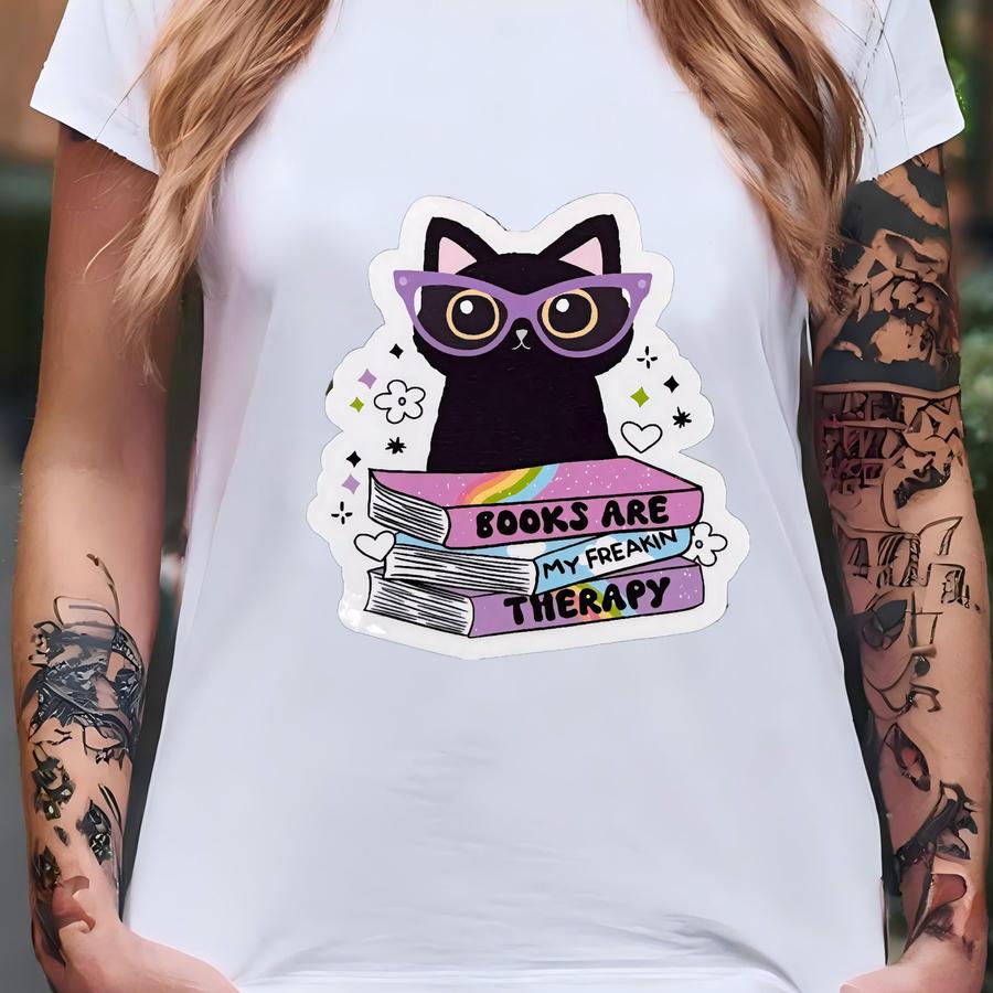 Bookish Black Cat Sticker: Books Are My Therapy, Kindle Laptop Decal T-shirt