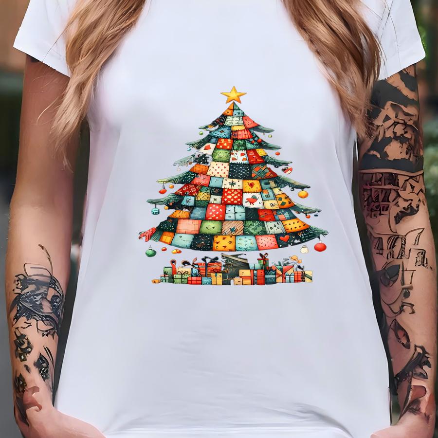 Retro Christmas Tree Shirt: Vintage Patchwork Bow Tee T-shirt