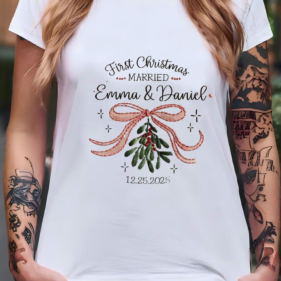 Coquette First Christmas Married Ornament: Couple Xmas Gift 2025 Christmas Family Keepsake, Name Christmas Sublimation T-shirt