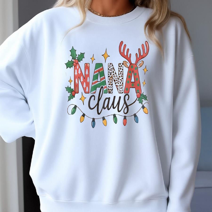 Nana Claus Christmas Bleached Flannel Shirt Holiday Lights Reindeer Antlers Festive Plaid Top Sweatshirt