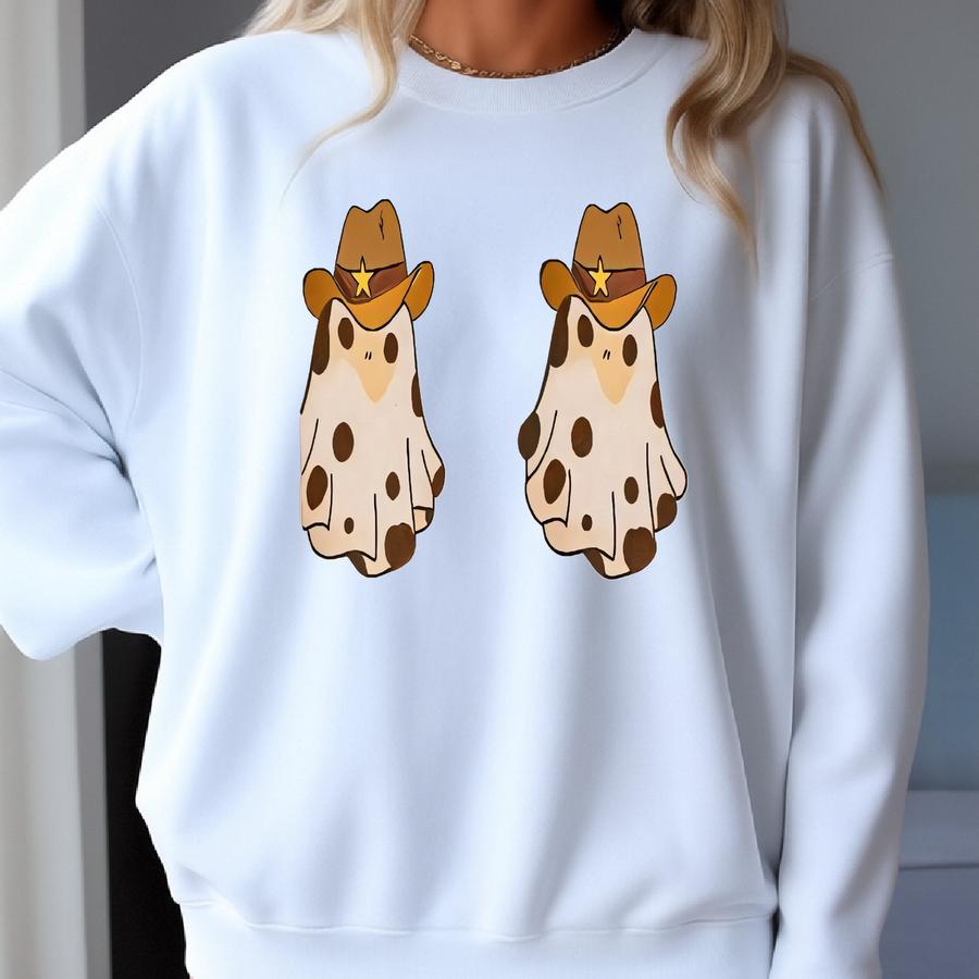 Women's Festival Crop Top, Cowboy Ghost Halloween Fall Funny Bra Tee, Western Hat Spooky Gift, Crop Tee For Women Sweatshirt