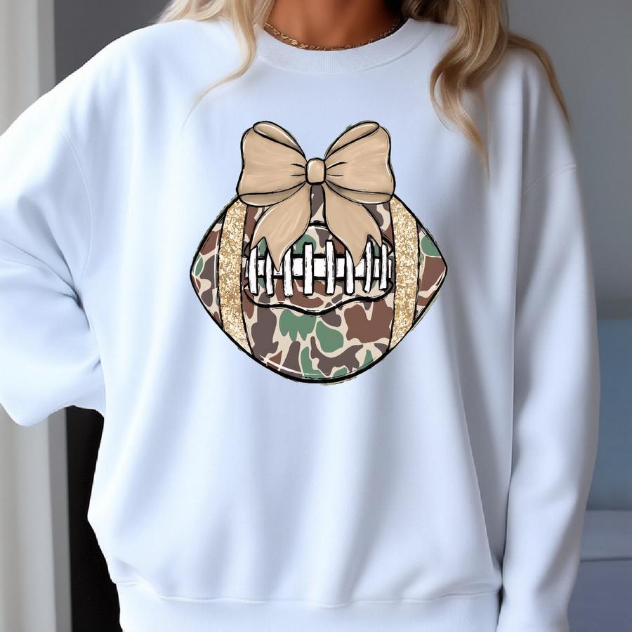Camo Bow Football Sweatshirt Or Hoodie | Game Day Glam Tee | Girly Fall Sports Top With Faux Glitter Look Sweatshirt