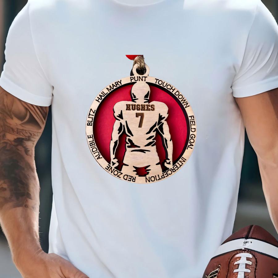 Personalized Football Player Ornament: Engraved Wood Car Charm T-shirt