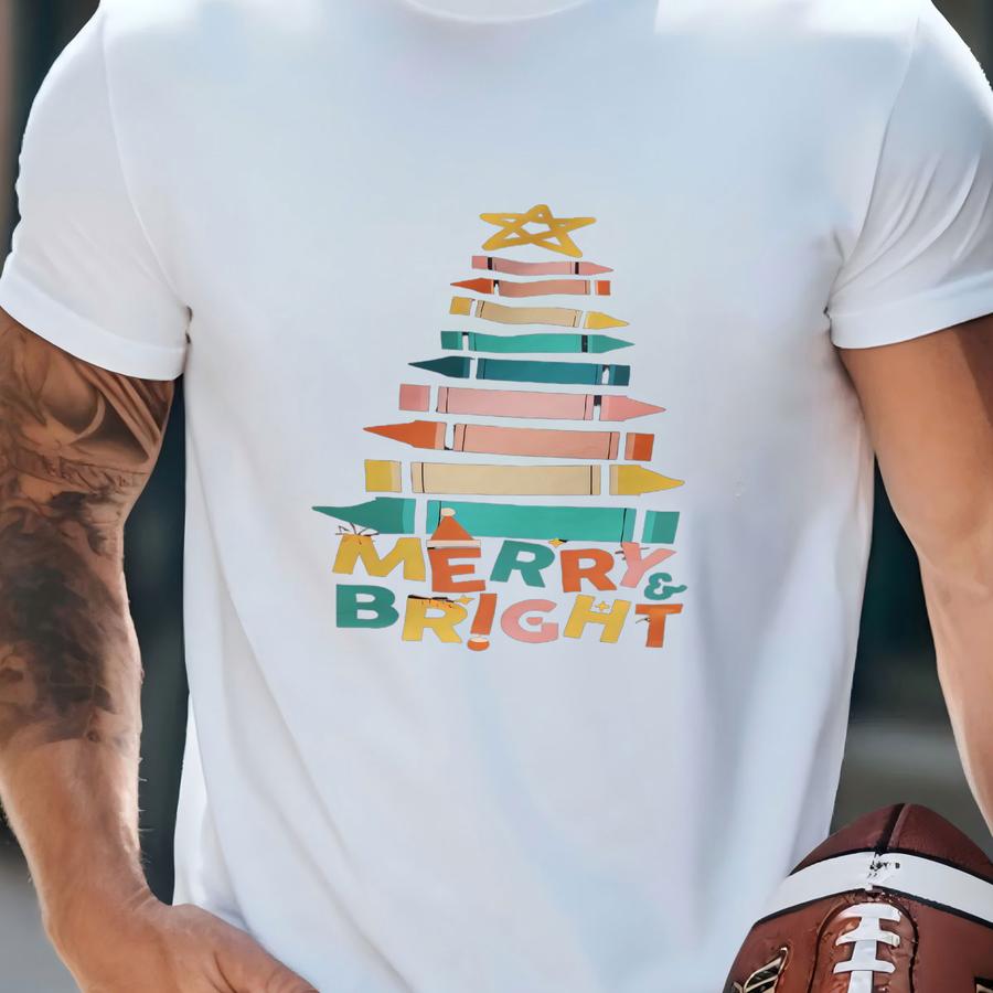 Merry And Bright Color Crayon Christmas Tree Teacher Sweatshirt, Holiday Teacher Sweatshirt, Christmas Gift For Preschool Teacher T-shirt
