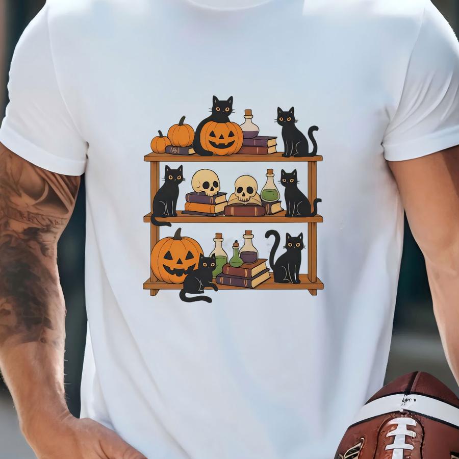 Halloween Cat Sweatshirt, Fall Cat Sweater, Bookshelf Sweatshirt, Autumn Crewneck, Spooky Vibes Crewneck,book Halloween Sweater T-shirt