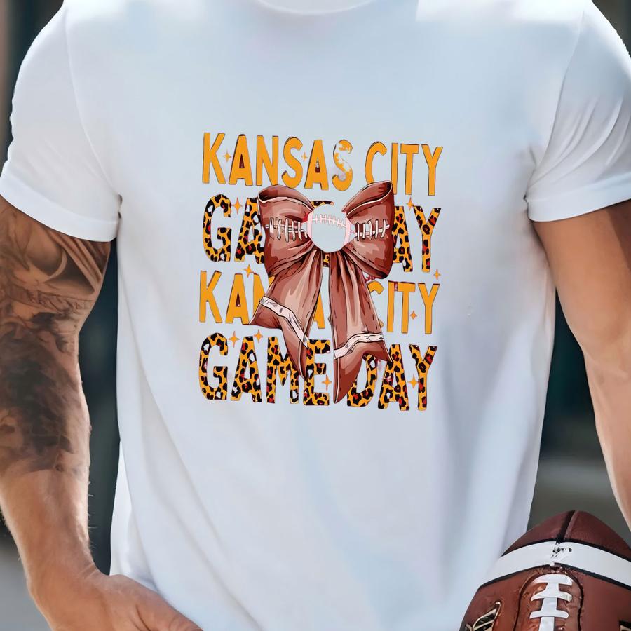 Kansas City Football Unisex Apparel, Mens Womens Tshirts/crewneck Sweatshirts/hoodies, Sports Fan, Game Day Outfit, Leopard Coquette Bow T-shirt
