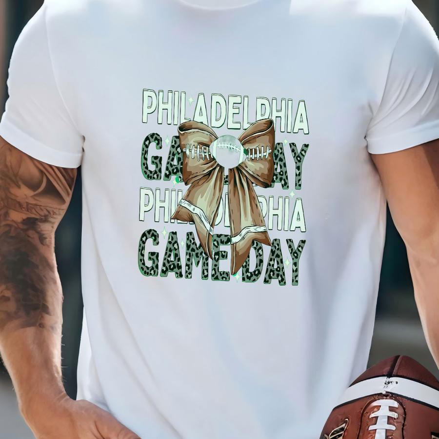 Philadelphia Football Apparel, Mens Womens Shirts Crewneck Sweatshirts Hoodies, Game Day Gift For Sports Fan, Leopard Coquette Bow T-shirt