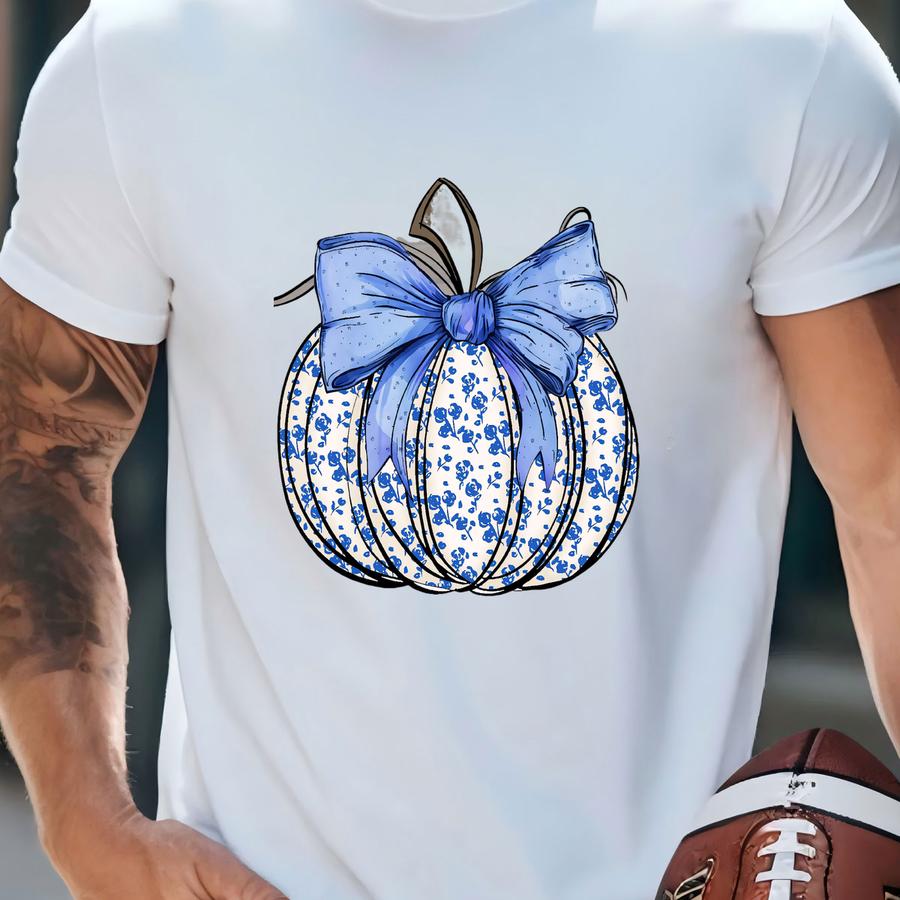 Fall Pumpkin Dtf Transfer, Blue Floral Pumpkin Iron-on, Diy Fall Apparel, Easy To Apply, Unique And Stylish Pumpkin Decal For Autumn Fashion T-shirt