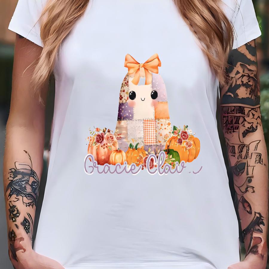 Patchwork Ghost Halloween Shirt Toddler Ghoul Spooky Cute Custom Name Sweatshirt Girly Fall Fashion Fall Bow Pumpkin Patch Outfit Youth Tee T-shirt