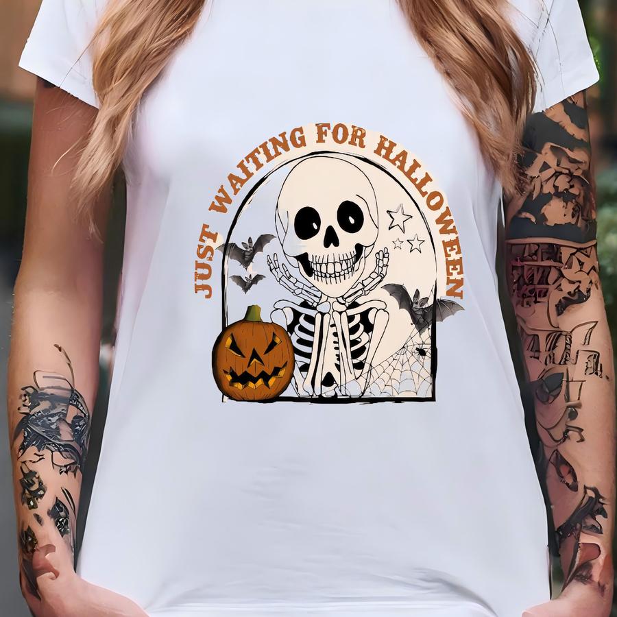 Just Waiting For Halloween Shirt Fall Sweatshirt Cute Skeleton Design Tshirt Autumn Tee Pumpkin Patch Outfit October Vibes Retro Vintage Tee T-shirt