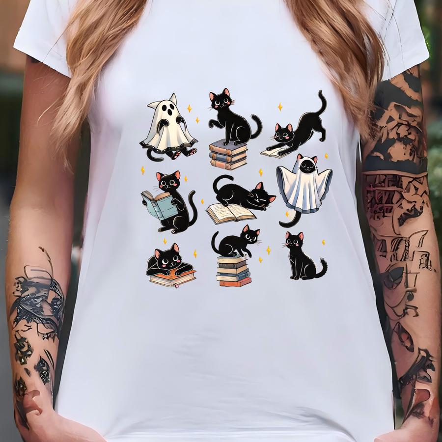 Oversized Sweater Spooky Black Kitten Ghost Reading Cat Sweatshirt Creepy Nerd Cat Gift For Reader Boho Outfit Fall Halloween Graphic Tee T-shirt