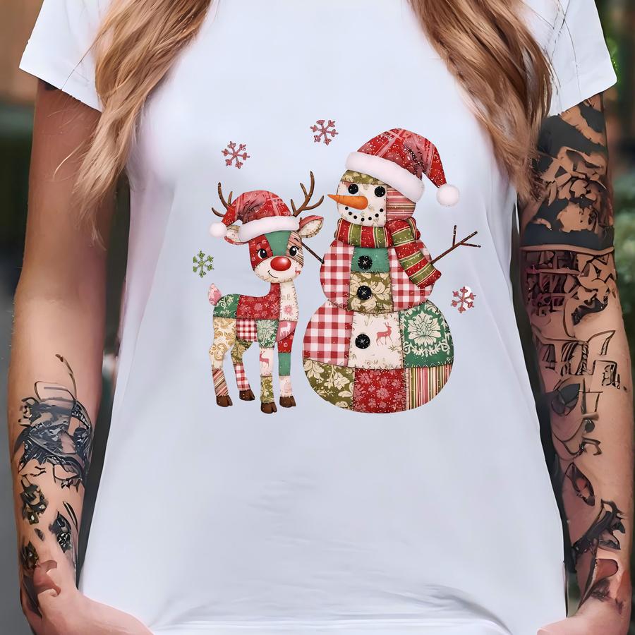 Patchwork Christmas Sweatshirt: Cozy Snowman And Reindeer Winter Style T-shirt